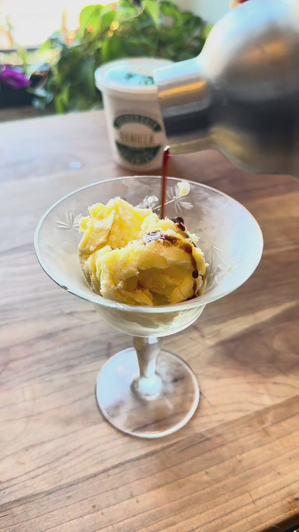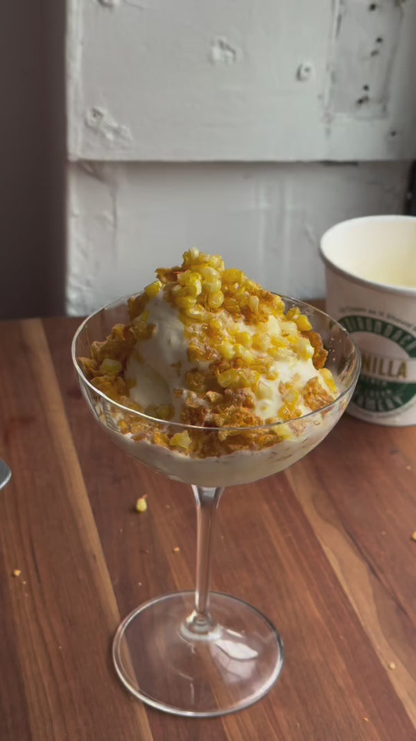 Fresh summer corn caramelized with butter, brown sugar, and a touch of salt, piled high on creamy Vanilla Ice Cream. The perfect summer treat — sweet, savory, and just right for August.